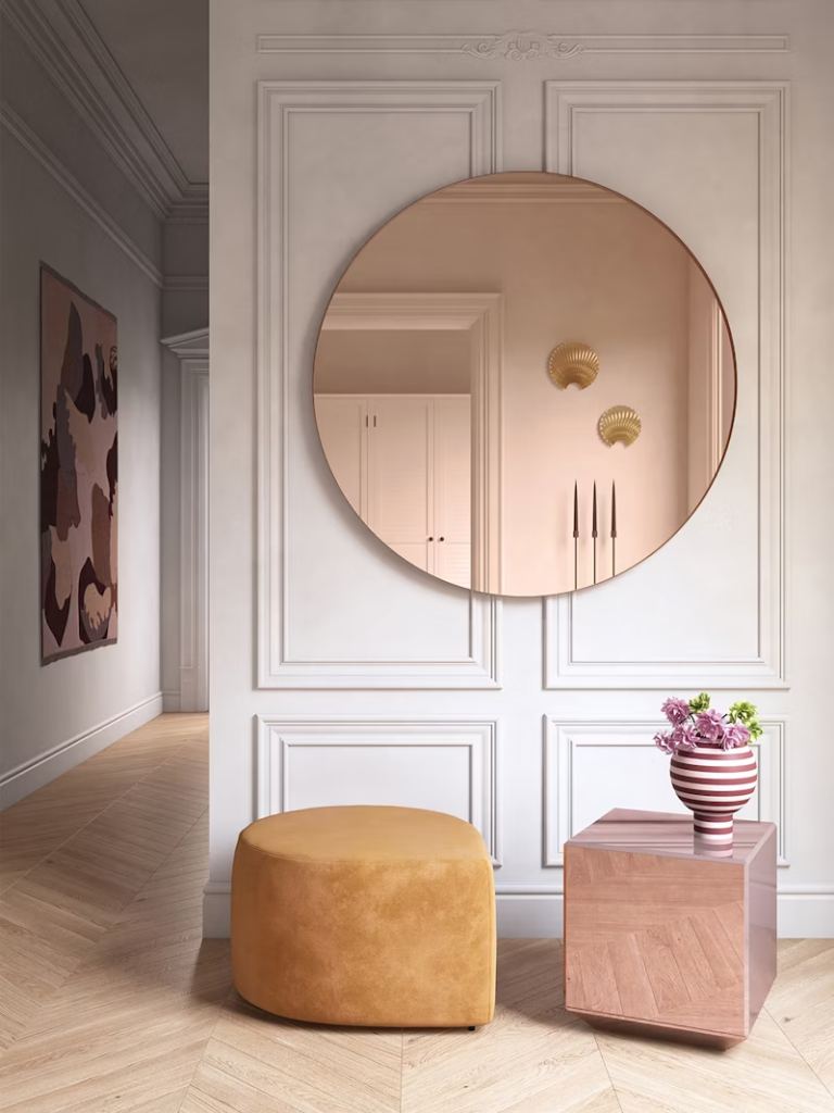 • På en nøytral vegg i stuen – for å speile lys og skape romfølelse